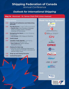 We are pleased to share the agenda for the Shipping Federation of Canada’s Annual Conference, “Outlook for International Shipping.”